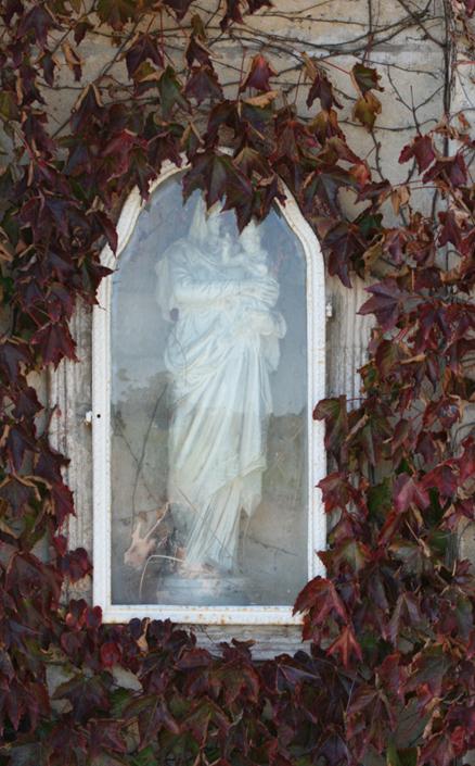 Une vierge à l’enfant enserrée dans un écrin de vigne rougeoyante.