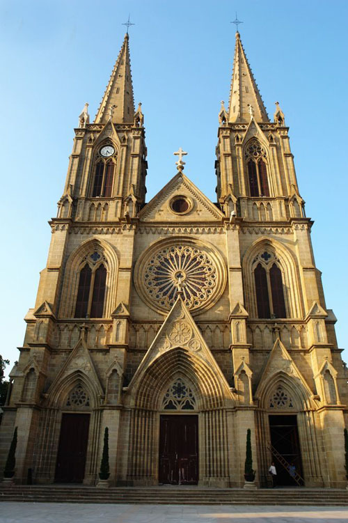 Là, dans le petit matin, une lueur, comme un rayon lumineux scrutant le Ciel, la Cathédrale du Sacré-Cœur de Jésus, émergeant des terres, semblable au bateau fantôme, dans une ascension verticale… Une cathédrale en pierre dans la Chine d’un autre âge.