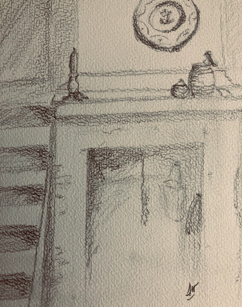 Elle pose alors quelques buches sans trop les serrer, laissant passer le filet d’air qui le fera grandir. Elle jette un œil derrière les épais rideaux de fenêtre après avoir mis sur ses épaules sa couverture de laine. Le jour se lève. La lueur éclabousse le mur de la maison et déborde autour du volet de bois mal ajusté. Le château s’éveille.