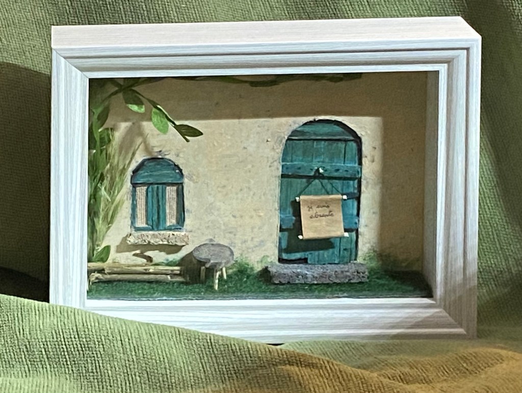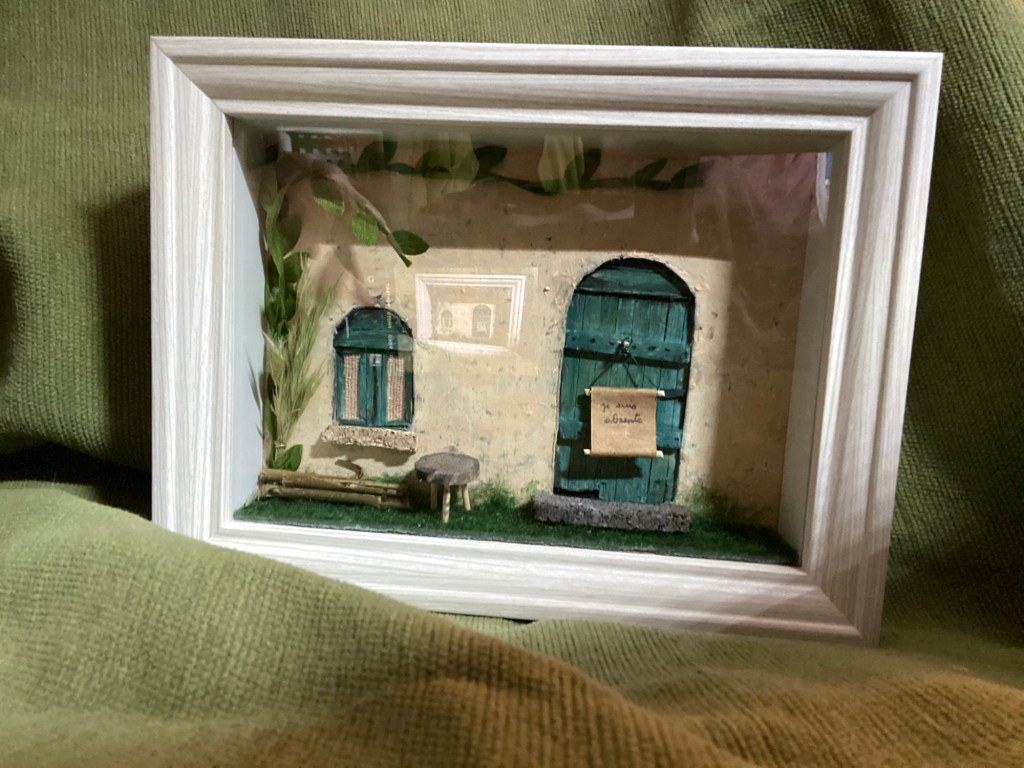 Choisir avec soin le poème pour accompagner mon premier « diorama dans un cadre », la façade d’une maison quelconque… toujours en apprentissage d’objets en miniature, voilà le travail d’une fin de semaine.