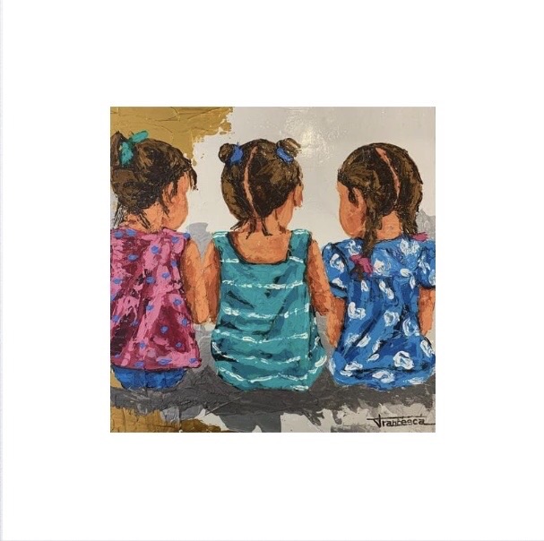 En examinant les toiles, j’ai été étonnée de voir les « sujets » (surtout des enfants) poser de dos ou de trois-quarts, bien qu’elle écrive que le corps humain et l’expression du visage sont mon inspiration et ma marque de fabrique. Les couleurs sont vives mais pas criardes. Une peinture contemporaine intéressante et à mon goût !