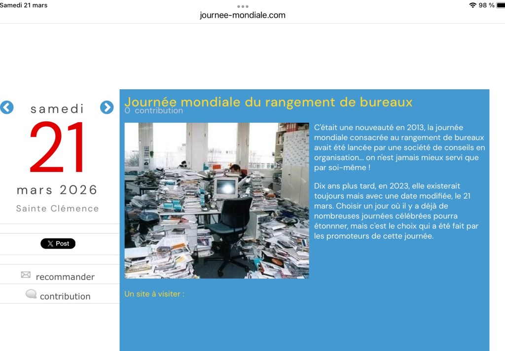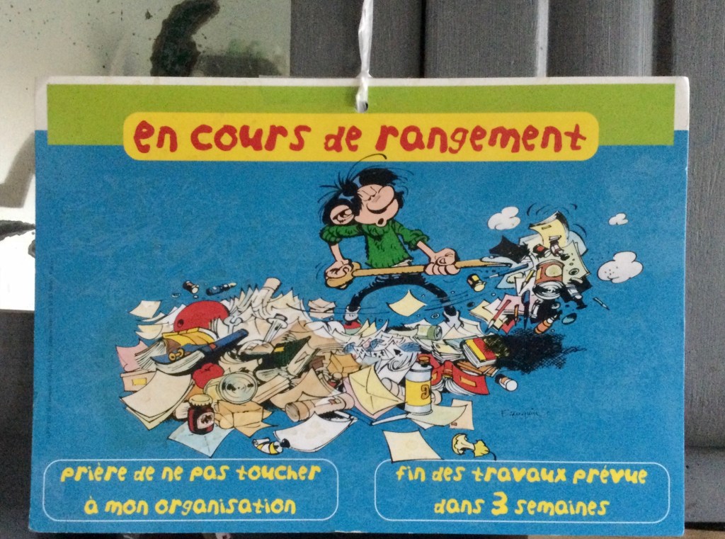 Cette pancarte achetée en Belgique lors d’un voyage pour des recherches généalogiques avec quelques collègues du CL il y a plus de 35 ans je crois… est toujours en ma possession et d’actualité… malheureusement… car oui, j’ai du mal à ranger mon bureau-atelier ! Alors je me déplace sur la table de la salle à manger qui elle aussi, se laisse envahir. Il me faut donc un week-end et parfois plus pour ranger, classer, archiver, jeter.