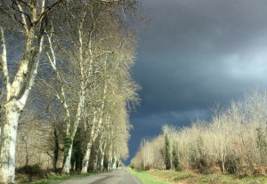 Ce matin, les nappes de brumes bleutées glissent sur les sillons laissés par la charrue. Les plaies ouvertes avalent goulûment les gouttelettes légères, un peuplier d’Italie émerge par moment de la nappe éphémère, dressant ses branches presque nues vers un ciel noyé. Au-delà, je devine les collines jouant du brouillard en nuances de gris-bleu. Reste là, si près, la brumaille à portée de main. Ouvrir la fenêtre, tout doucement, deviner les premiers piaillements, caresser la chatte isabelle qui saute sur le rebord et fixer l’instant, avec mes mots, et un instantané.