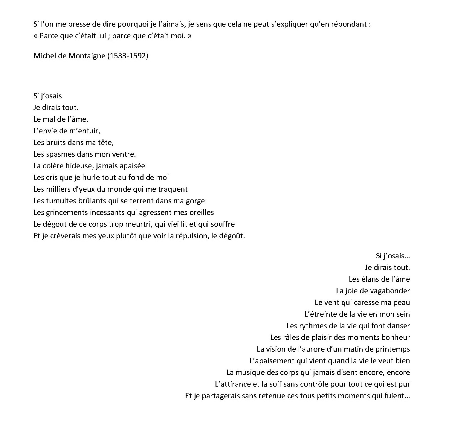 Alors, il se souvenait comme il se sentait petit au milieu des siens, même s’il se savait frêle et fragile du haut de ses dix mètrées, et même s’il devait partir sans se retourner, le cœur gros à en pleurer ses feuilles, il avait tremblé de tout son être lors de son acceptation,