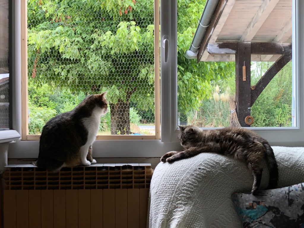 Si j’ai gardé un « réveil-matin », c’est d’abord pour rythmer mes journées, mais surtout pour ne pas faire attendre les minettes qui m’accompagnent dans ce temps de retraite déjà bien entamé. Donc Follette, la doyenne (14 ans) et Galipette (5 ans), attendent leur premier repas de la journée. J’ai dans l’idée que Follette envoie Galipette en émissaire chaque matin car elle me chante sa chanson de désespoir derrière ma porte. Pépiements du réveil-matin et miaulements coïncident et je me lève.